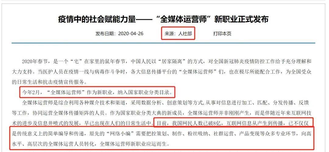 2020年2月25日,人力资源社会保障部与市场监管总局、国家统计局联合向社会发布了16个新职业,“全媒体运营师”作为传媒行业唯一官方认可职业正式问世,并被纳入《中华人民共和国职业大典》。